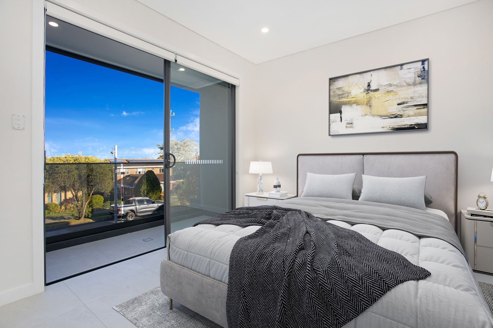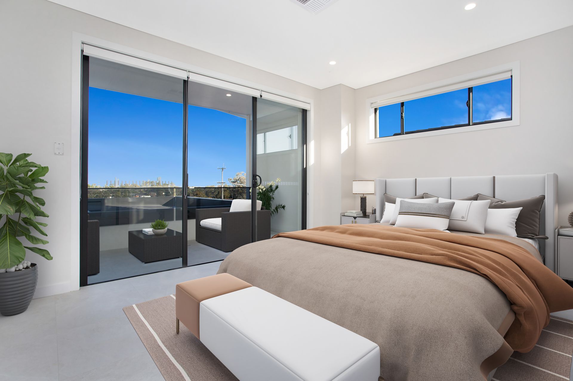 • The master bedroom features a walk-in wardrobe, ensuite bathroom, and balcony access