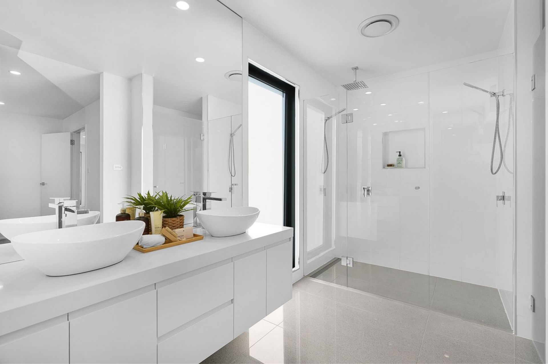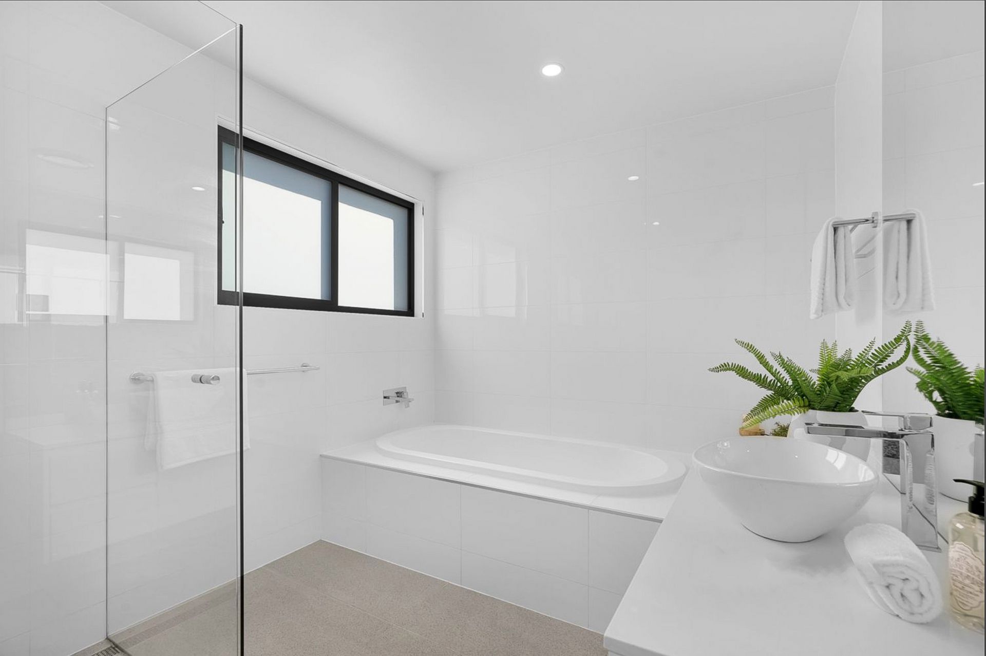 • Elegant family bathroom with frameless shower and separate bath