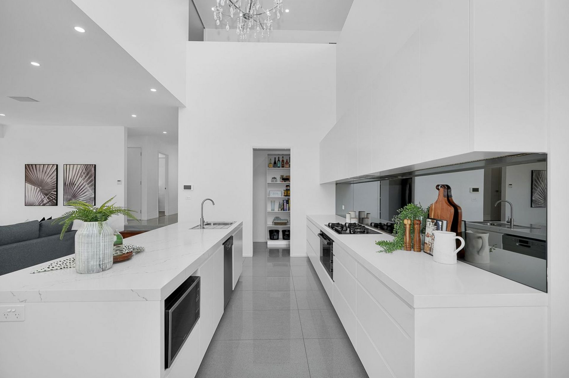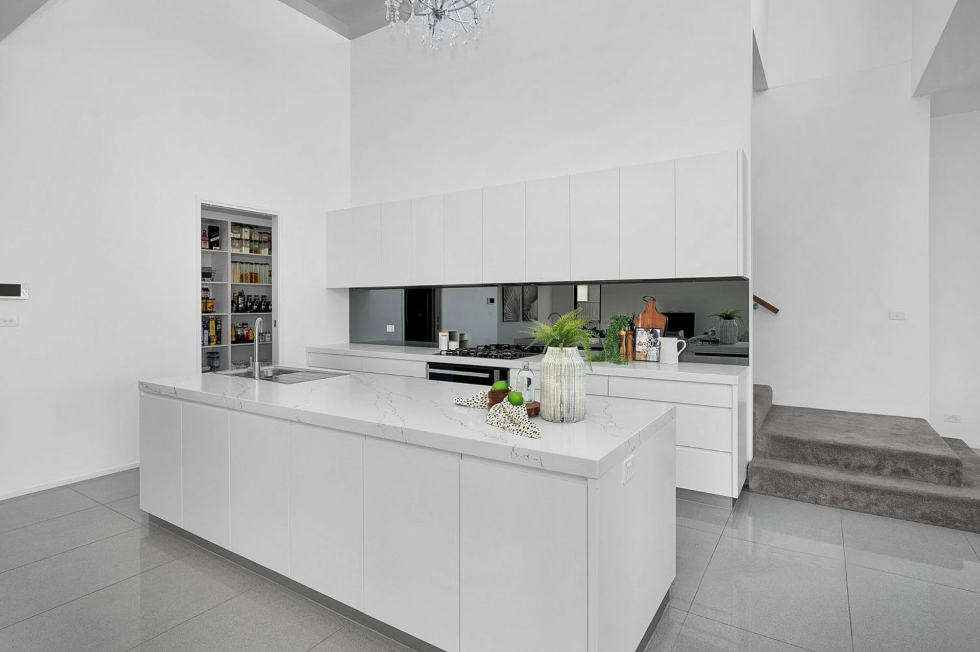 • Beautiful gas kitchen with walk-in pantry, island bench, stone benchtops, mirror splashbacks, stainless-steel appliances, abundant storage and extensive preparation space