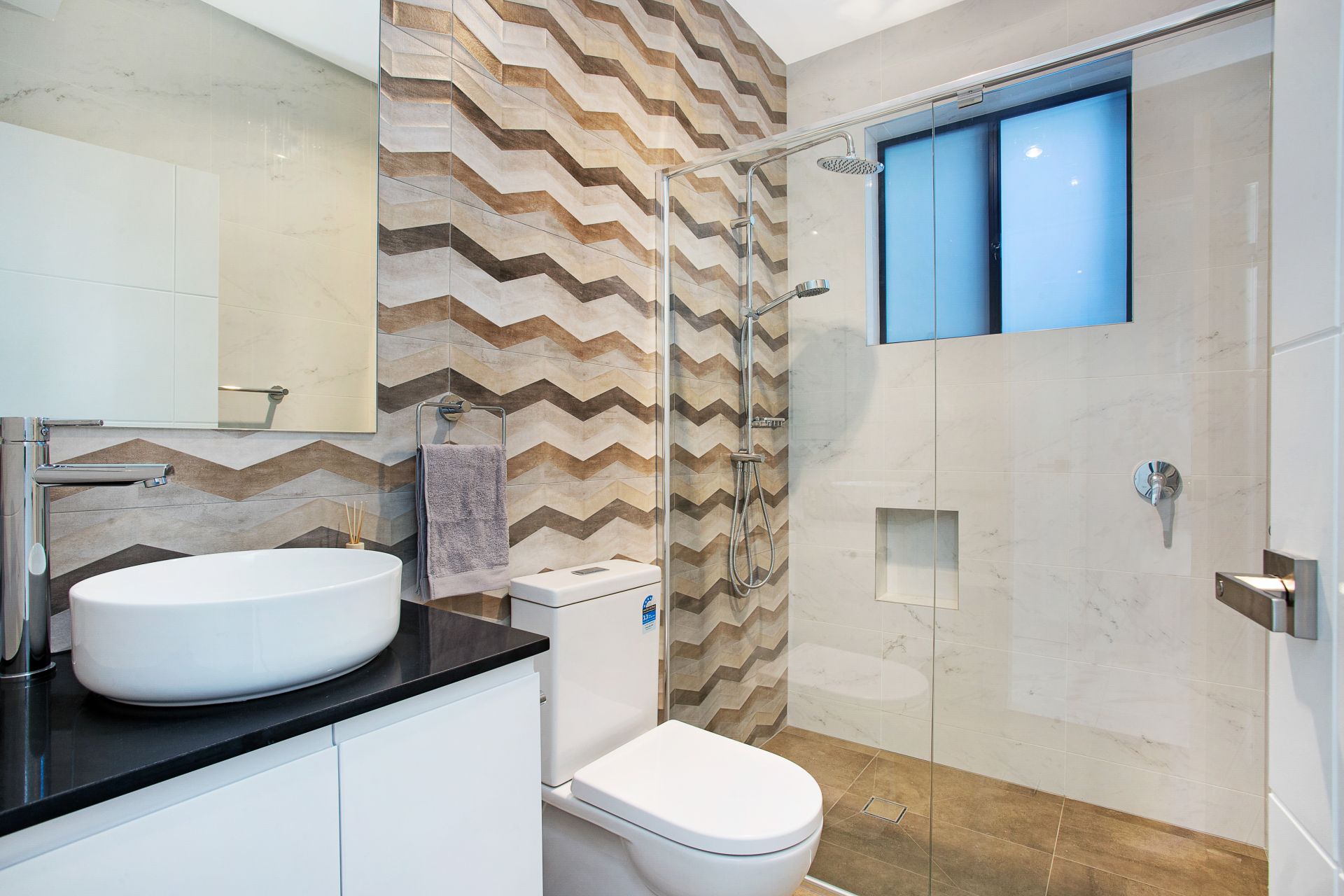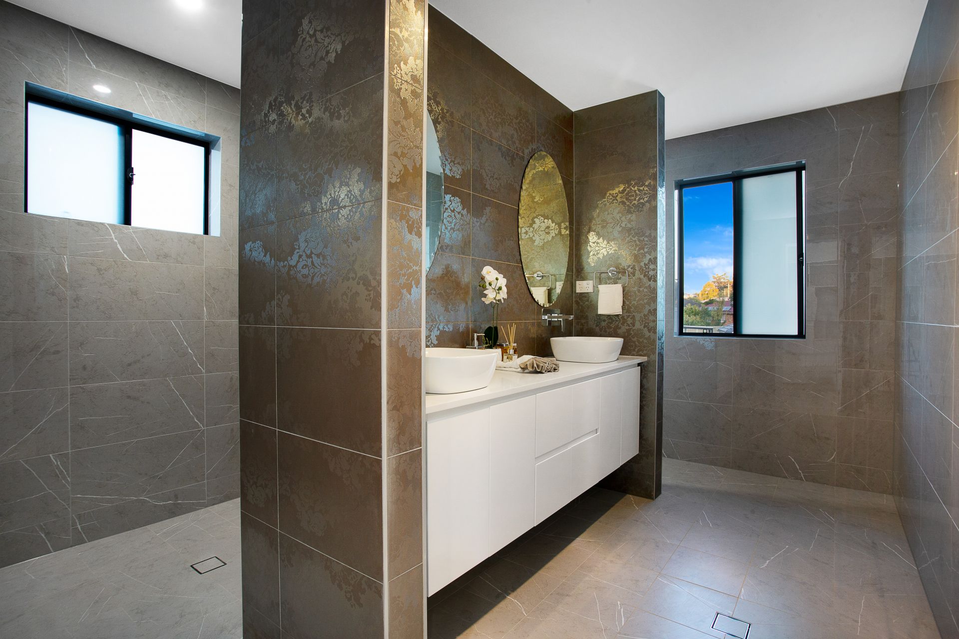 • Enormous, fully-tiled, magnificently modern family bathroom with separate bath and shower