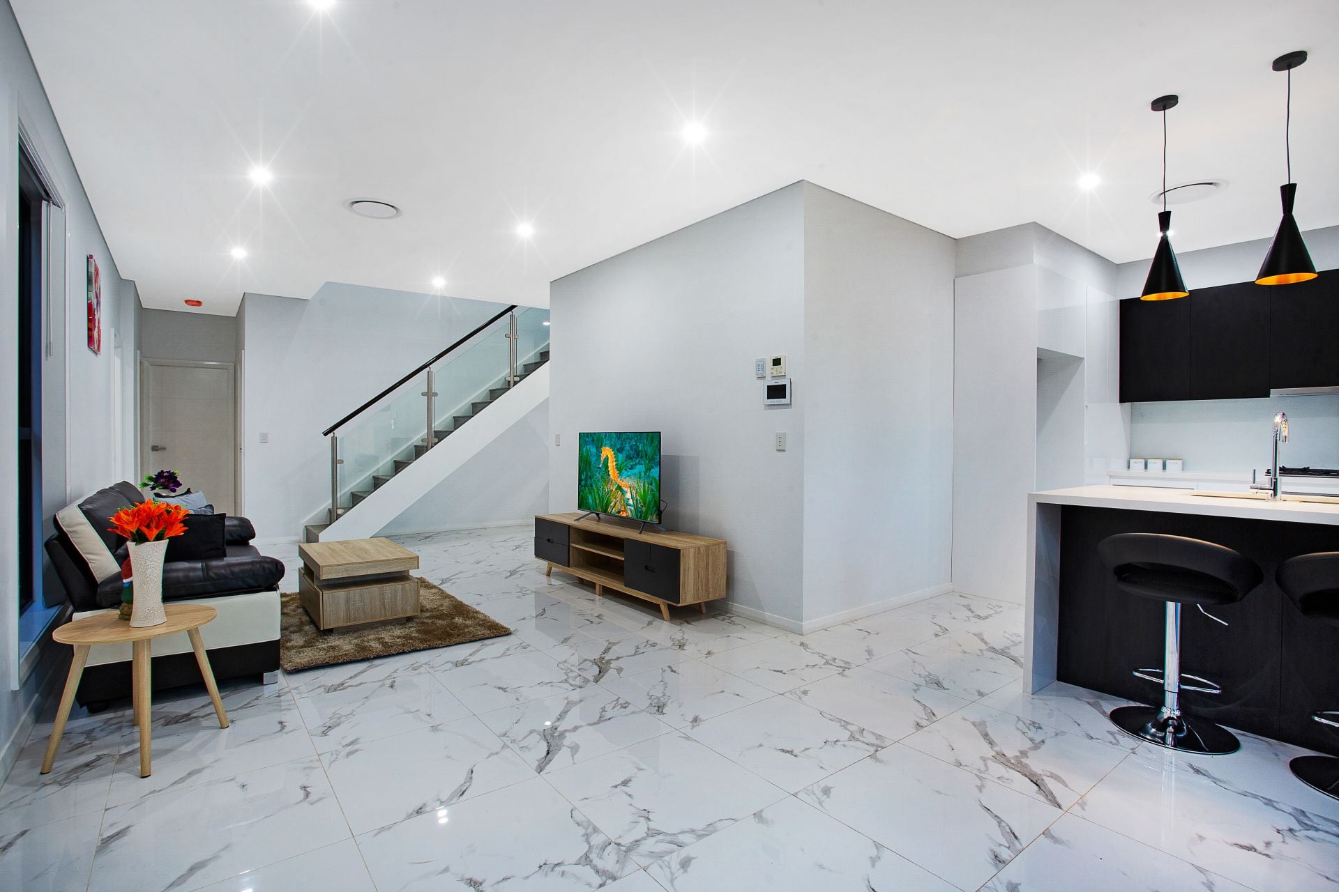 • Breathtaking, radiant contemporary kitchen with breakfast bar, stone waterfall benchtops, stainless-steel appliances and an abundance of preparation space and plentiful storage
