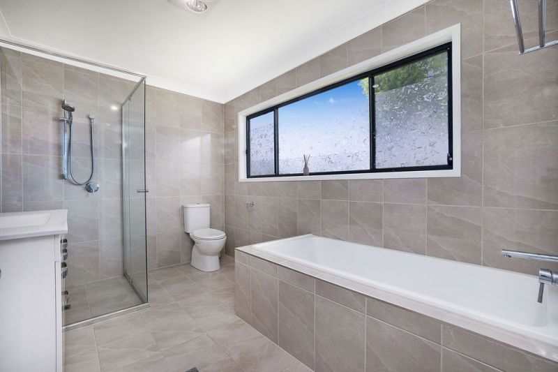 • Roomy, light-filled, fully-tiled family bathroom with separate bath and shower