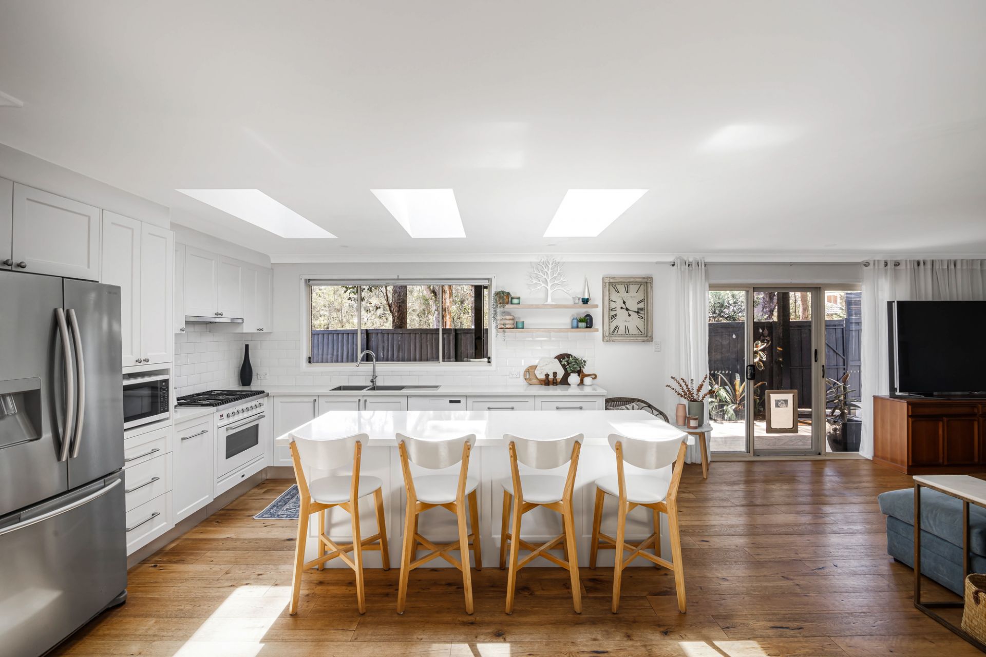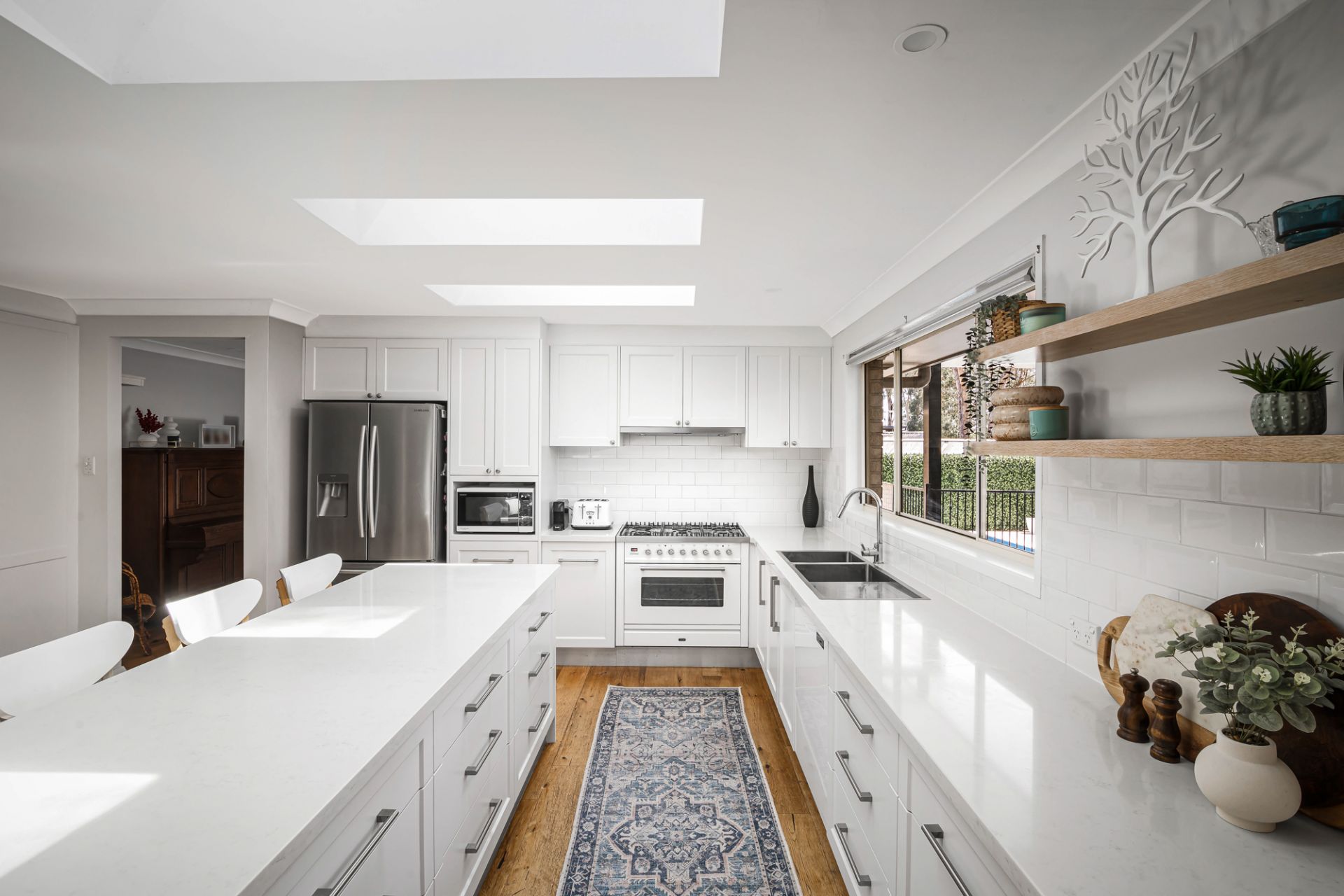 - Gas kitchen with pantry, island bench, breakfast bar, subway tile splashback, plentiful preparation space and abundant storage