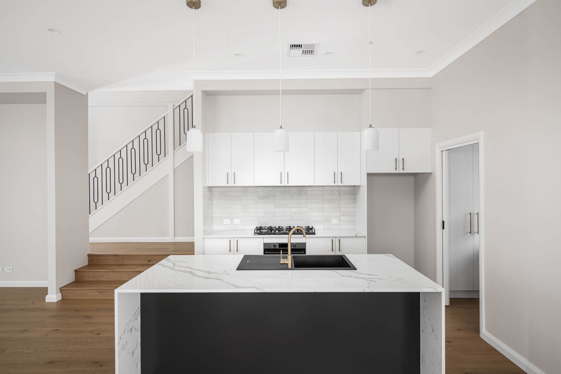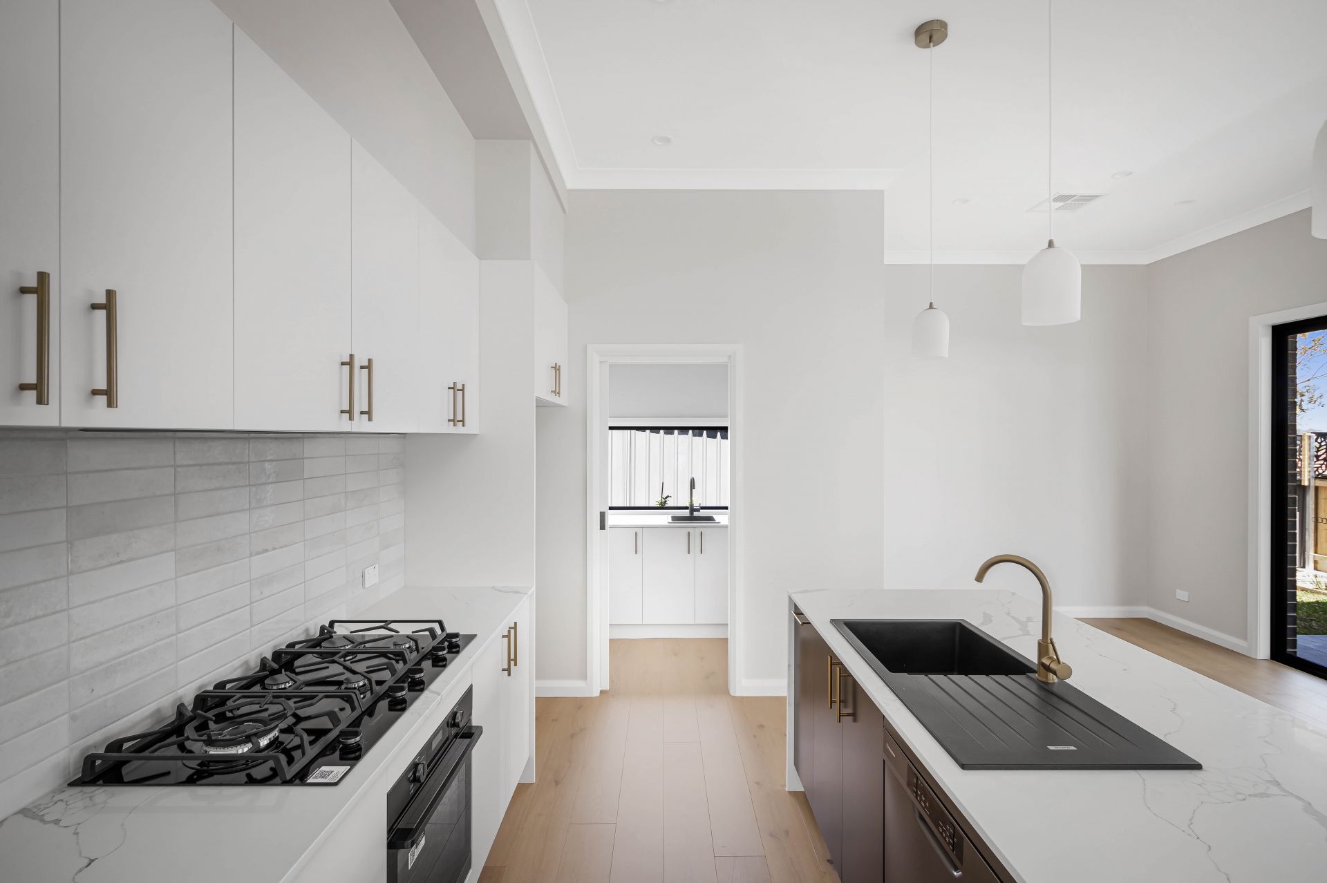 • Contemporary gas kitchen with breakfast bar, pantry, stone benchtops, subway tile splashbacks, and plenty of preparation space and storage room
