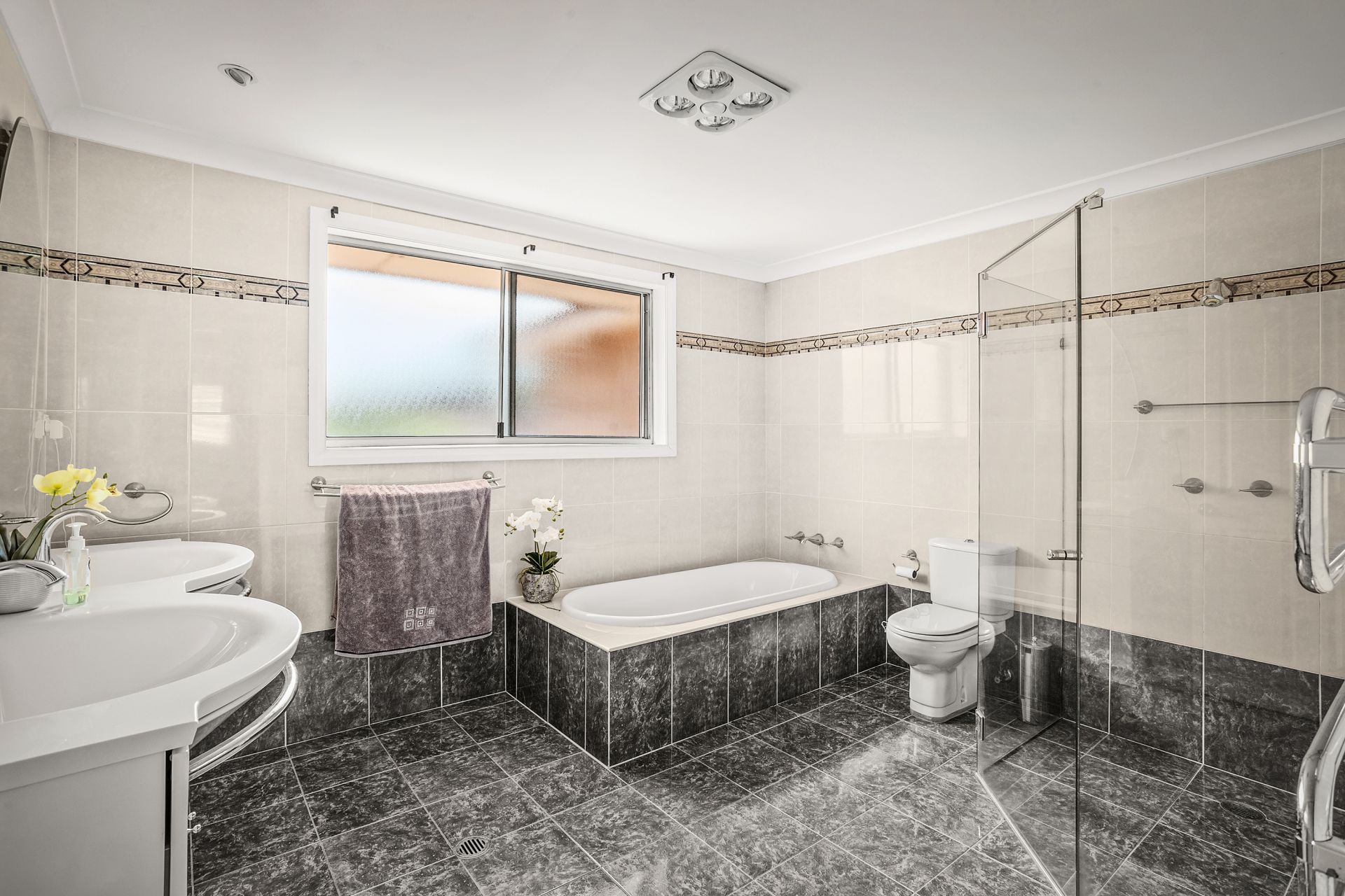 • Sumptuous, fully-tiled king size family bathroom/toilet with separate bath and frameless shower, twin basins, plus second bathroom