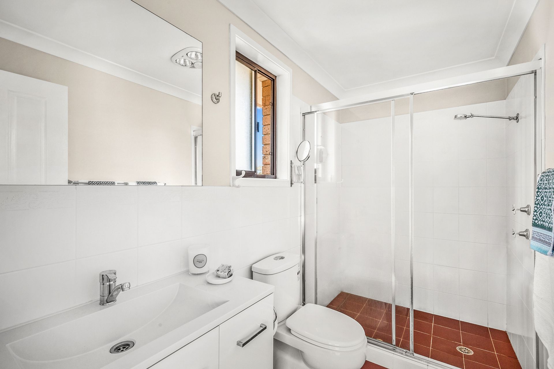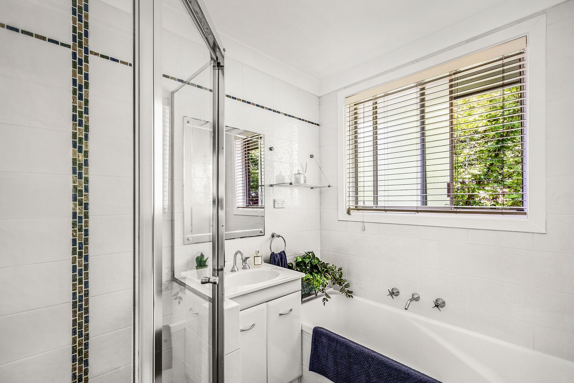 • Fully-tiled, light-filled family bathroom offering separate bath and shower