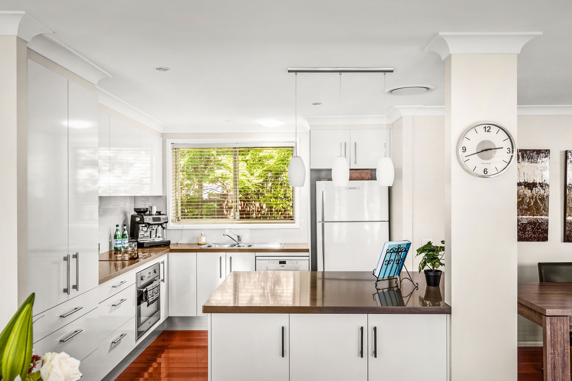 • Beautiful, contemporary kitchen with stone benchtops, stainless-steel appliances, breakfast bar and plentiful preparation and storage area