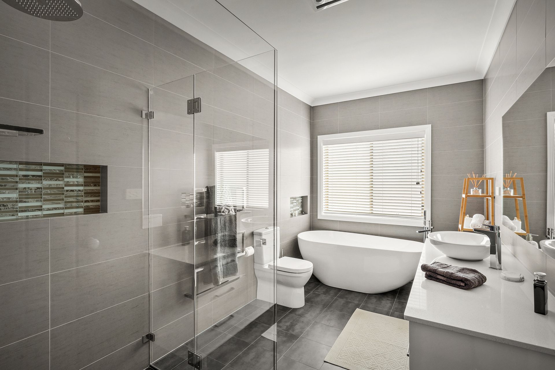 • Radiant, contemporary, fully-tiled family bathroom with frameless shower and separate, deep bath