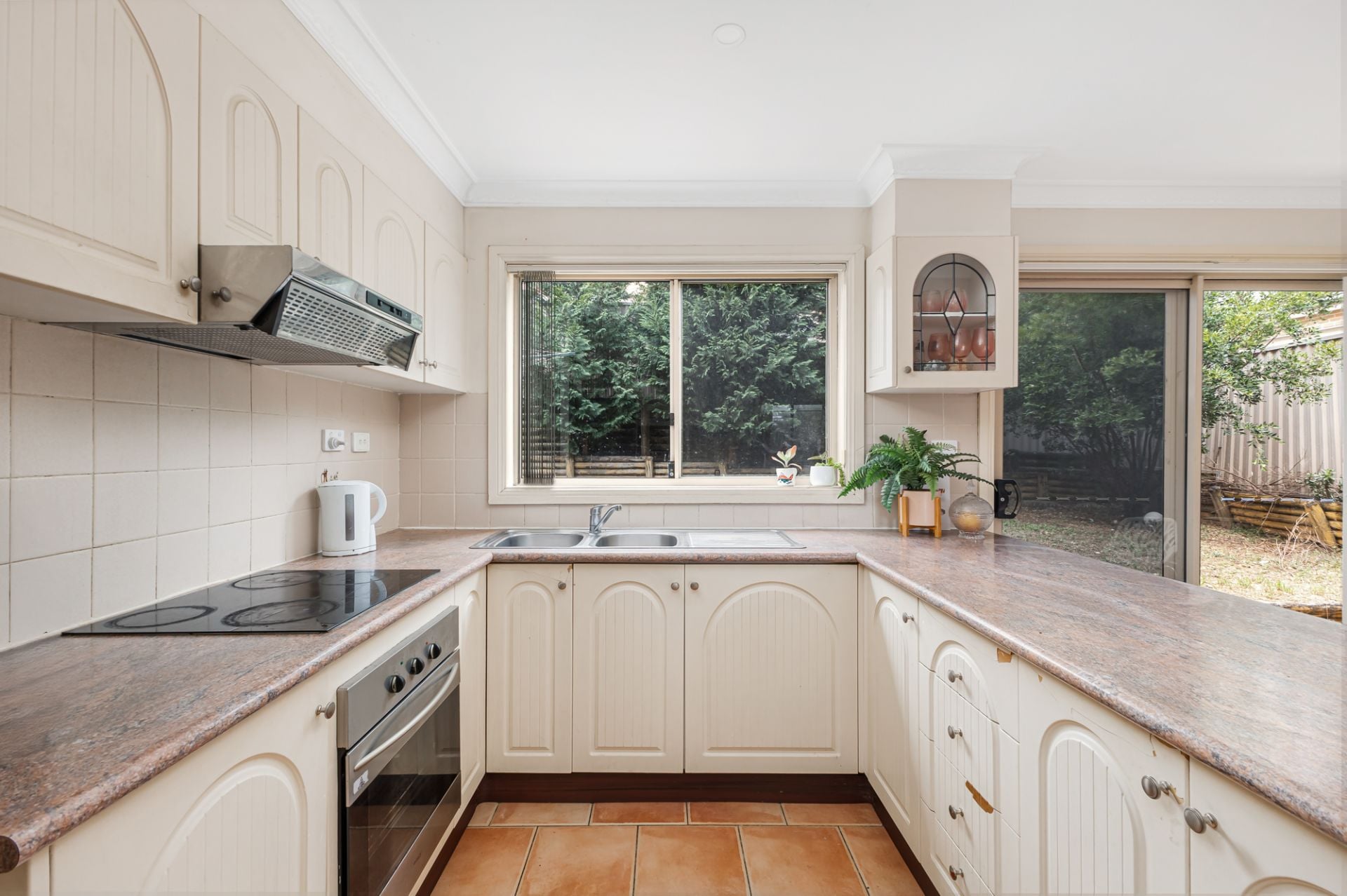 • Galley-style kitchen with breakfast bar, pantry, stainless-steel appliances, tiled splashbacks and plenty of bench and storage space