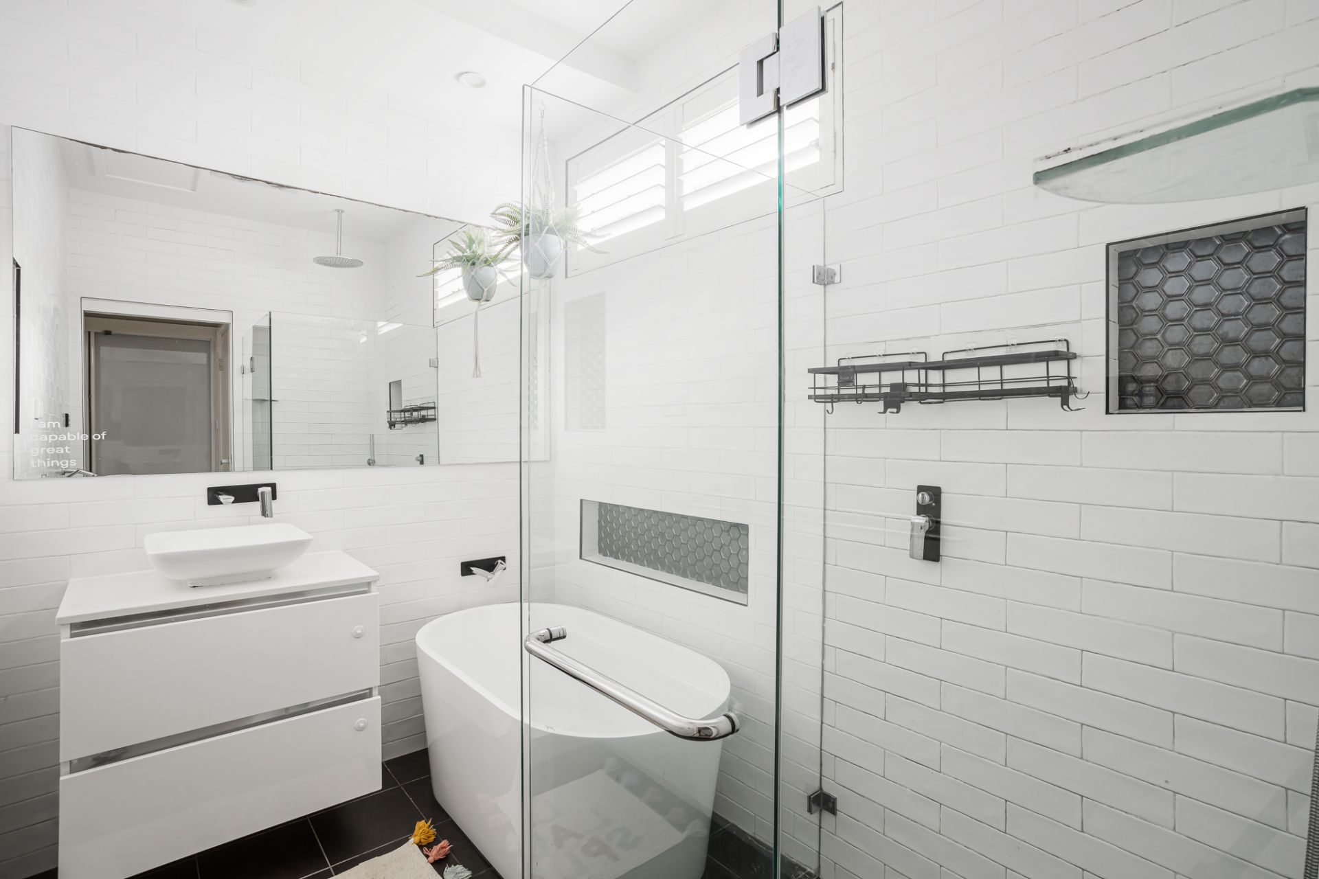• Family bathroom with separate deep bath and subway-tiled frameless shower