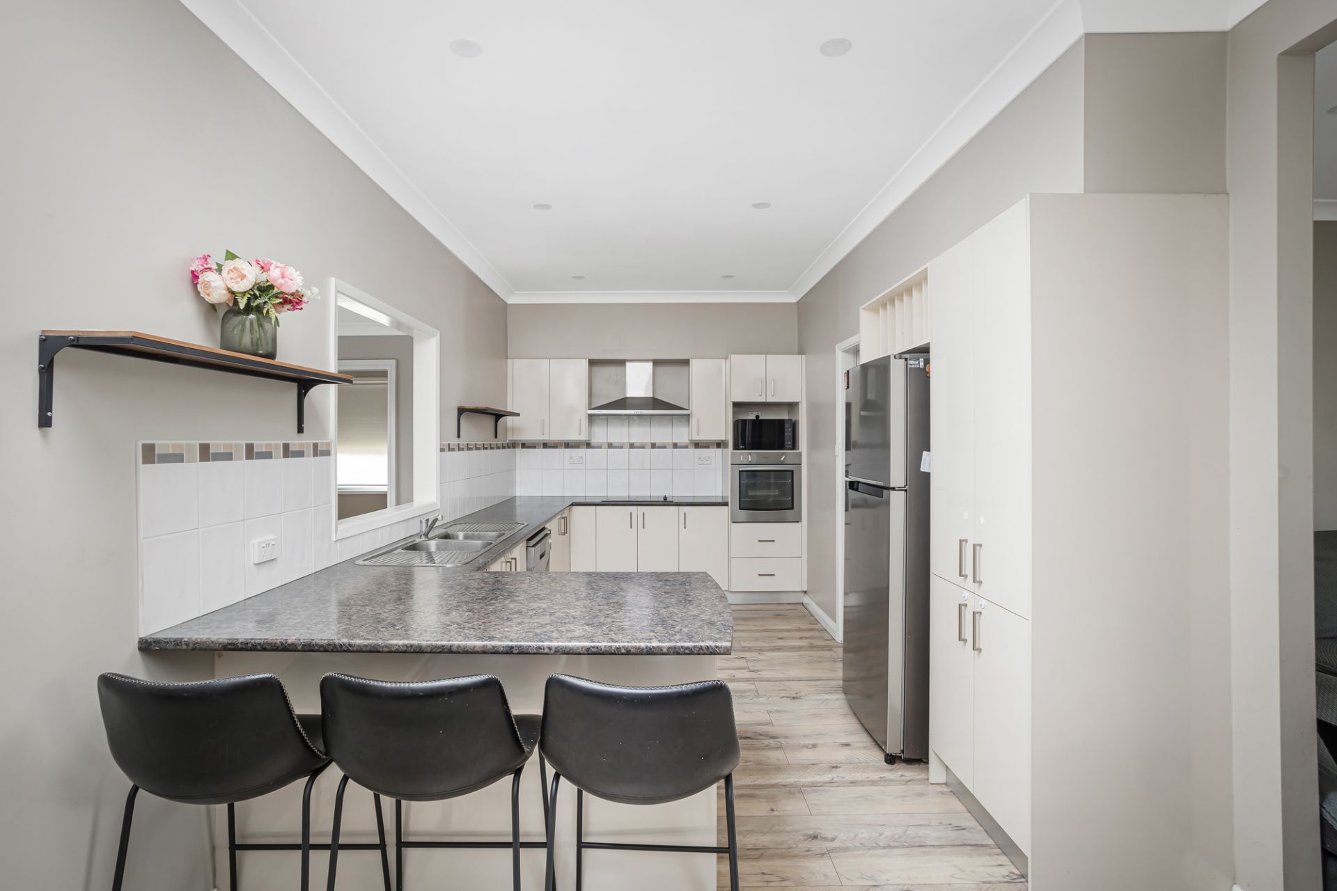 • Contemporary kitchen with breakfast bar, pantry stainless-steel appliances including suspended range hood, servery to dining room and plenty of preparation and storage space