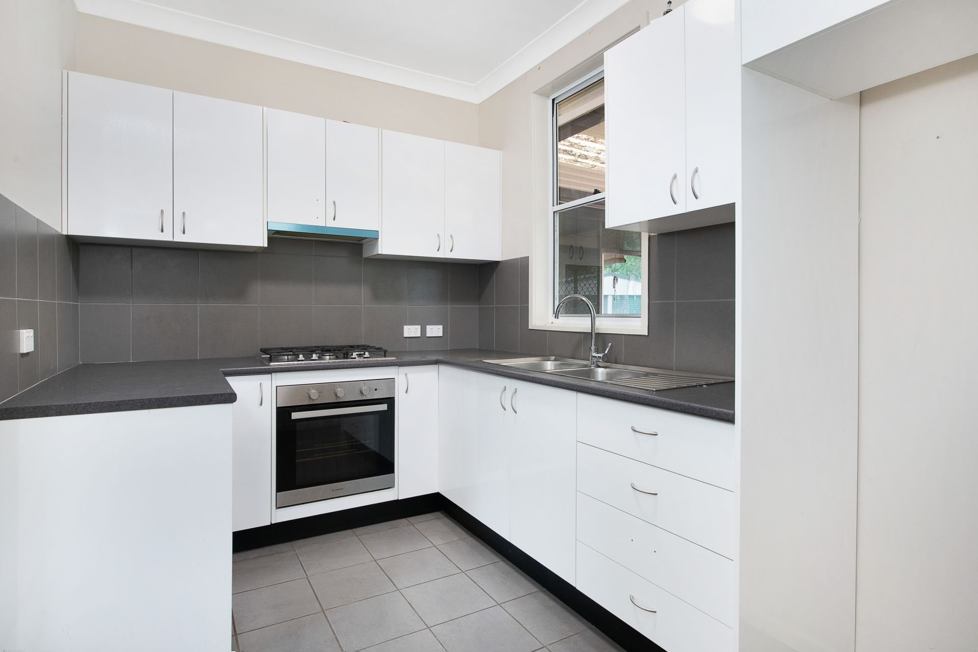 • Modernised gas kitchen with stainless-steel appliances, tiled splash-back, and ample storage and preparation space