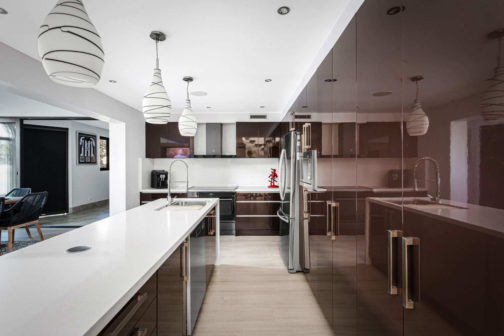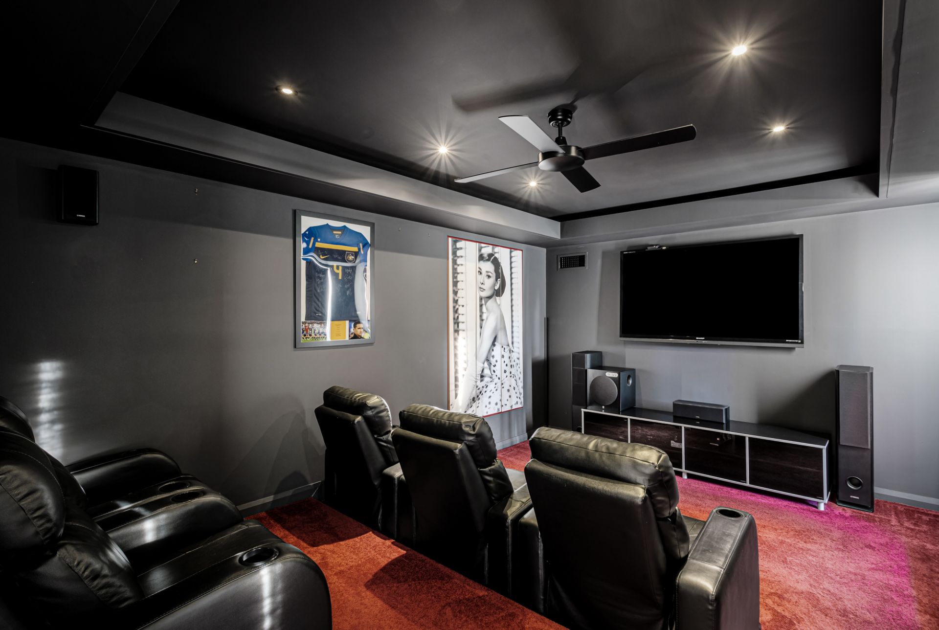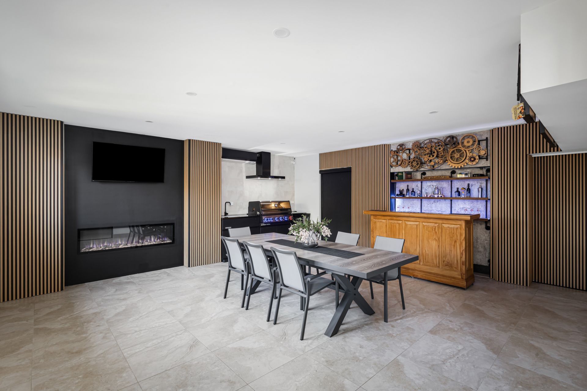 • Massive indoor entertaining area with bar, wall-mounted gas fireplace, separate air-conditioning, barbecue with range hood, built-in fridge and kitchenette