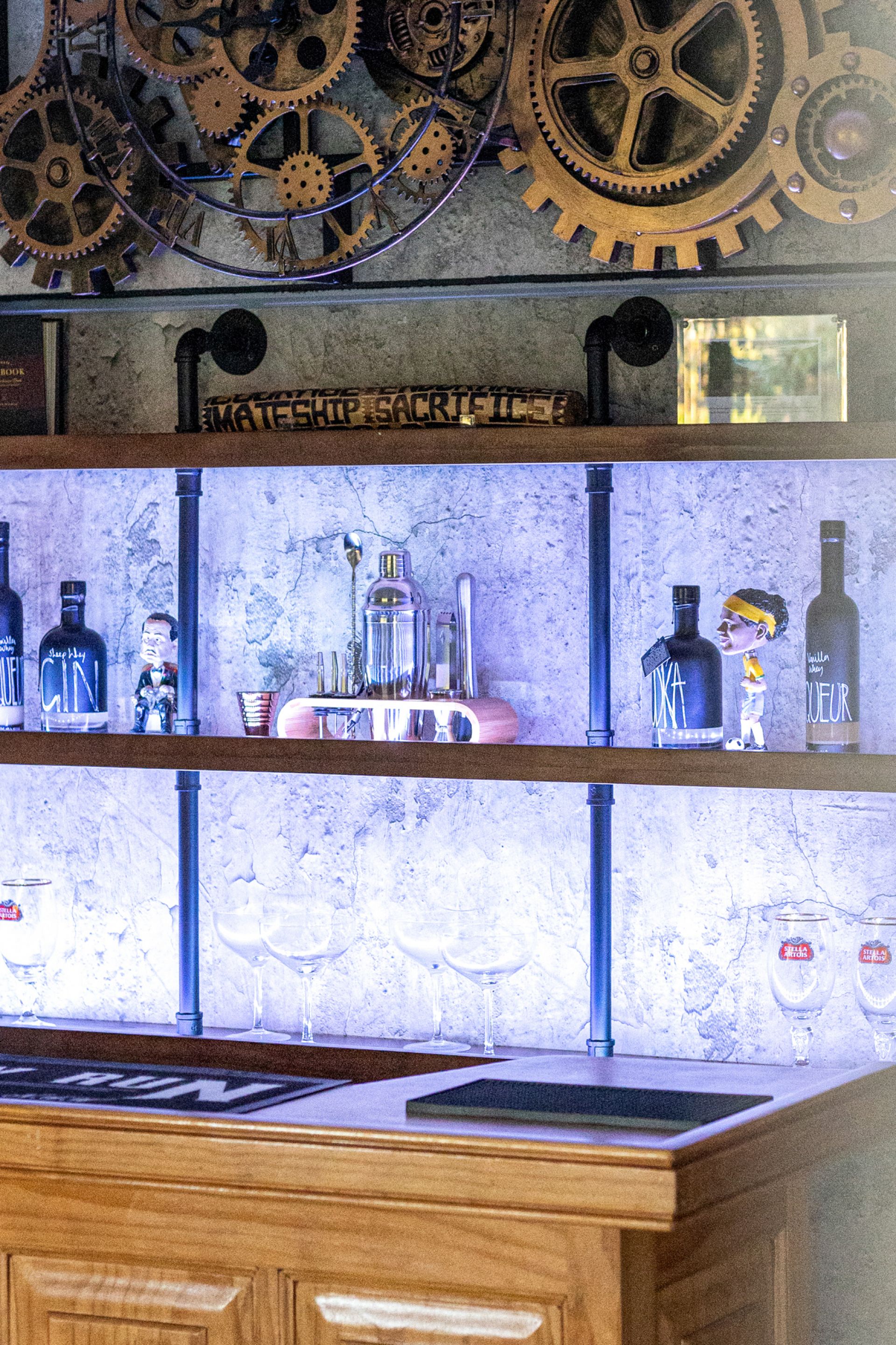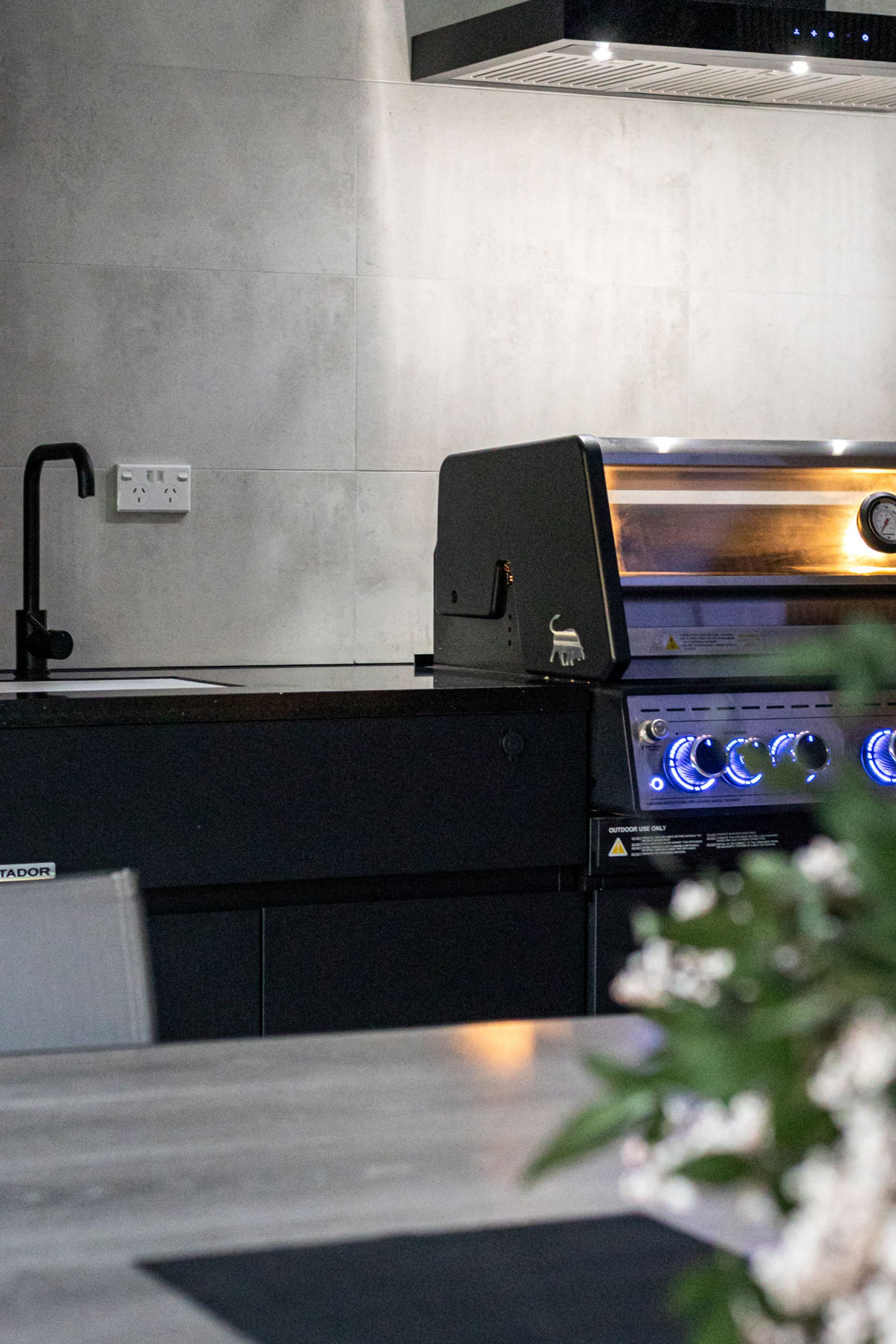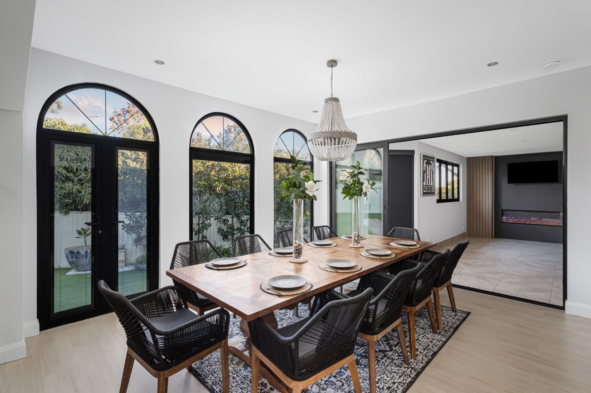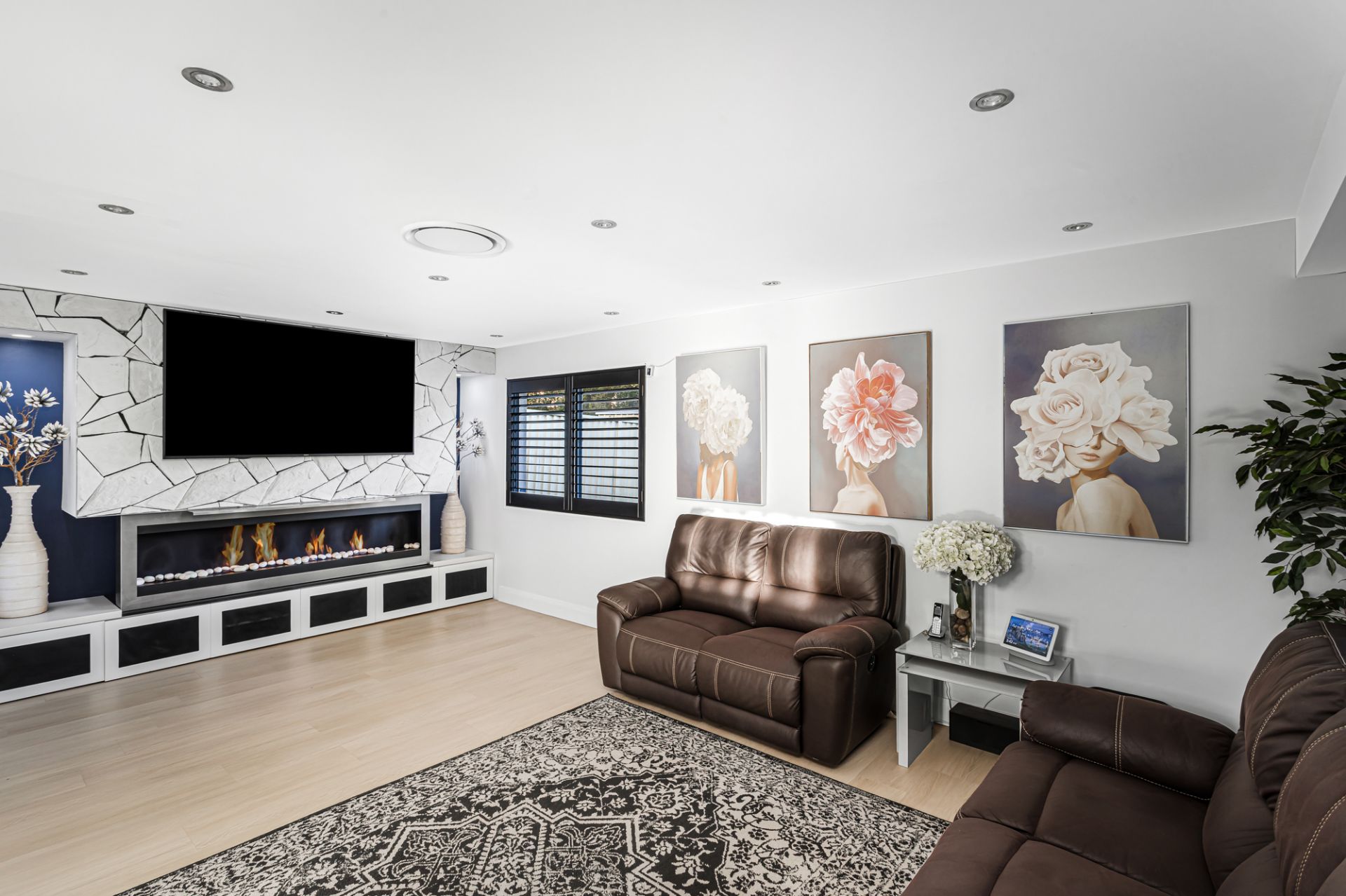 • Massive indoor entertaining area with bar, wall-mounted gas fireplace, separate air-conditioning, barbecue with range hood, built-in fridge and kitchenette