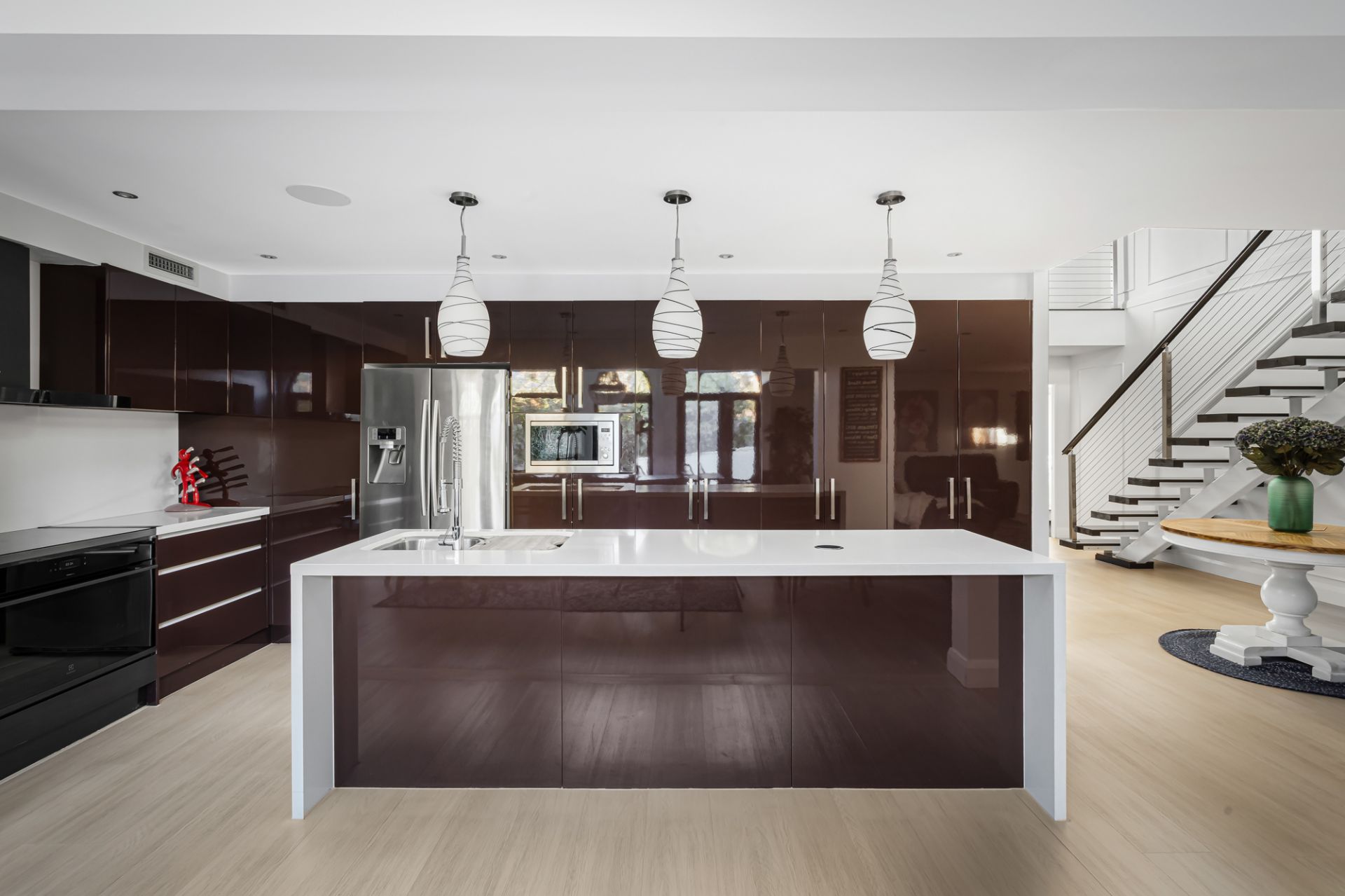 • Roomy contemporary kitchen with Electrolux 90cm freestanding oven with induction cooktop, Electrolux 90cm Hob2Hood canopy rangehood that automatically activates and adjusts fan speed, breakfast bar, stone benchtops, stainless-steel appliances, soft-close drawers, plentiful pantry spaces, and abundant preparation room and storage
