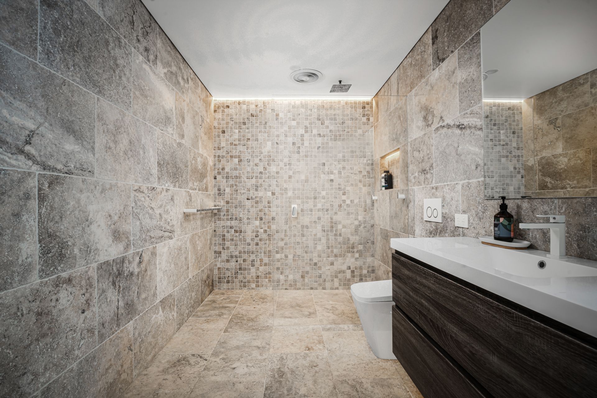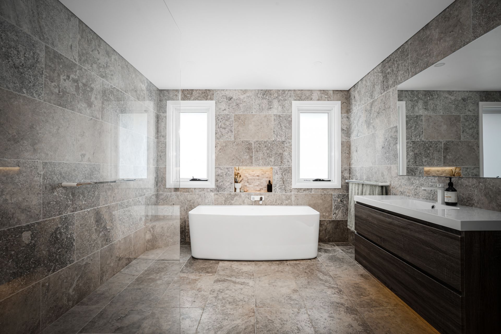 • Stunning fully-tiled family bathroom with classy earth-toned tiling from floor to ceiling, separate bath and frameless shower, heated flooring
