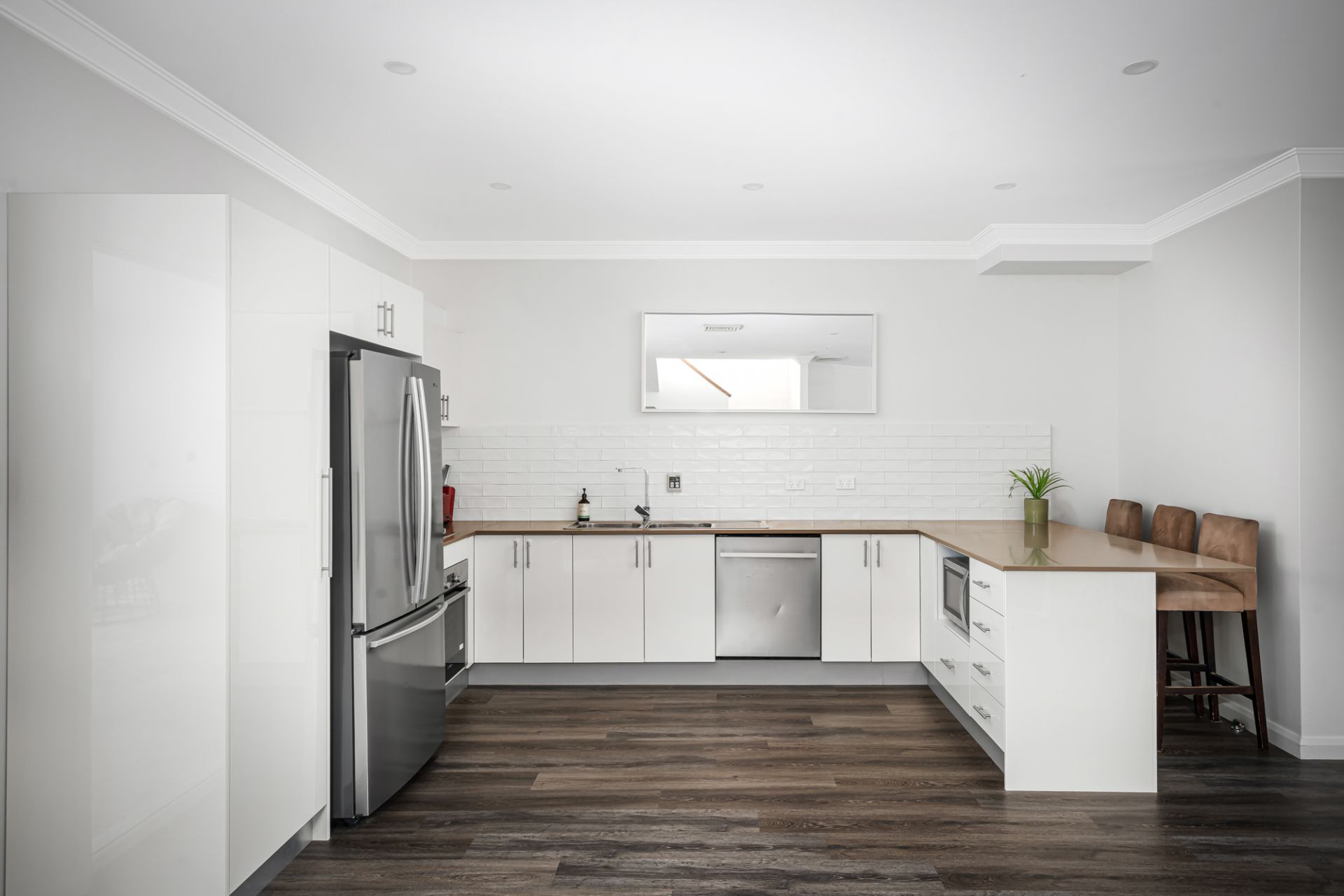 • Modern kitchen with stone benchtops, stainless-steel appliances, subway tile splashbacks and plentiful preparation and storage space