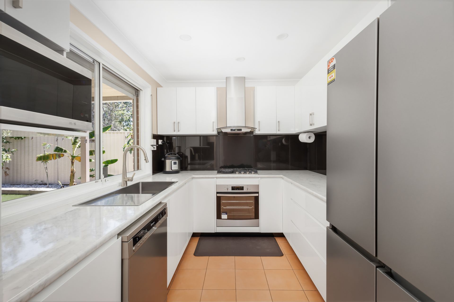 • Radiant, modern galley-style gas kitchen with stainless-steel appliances, soft-close drawers and abundant preparation and storage space