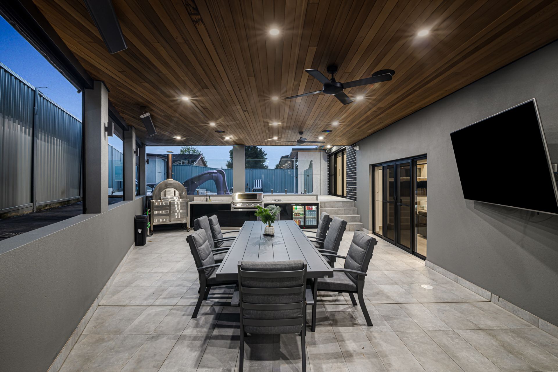 • Covered, paved alfresco dining and entertainment area with timber ceilings, downlights, ceiling fans, built-in barbecue and stainless-steel pizza oven, kitchenette with stone benchtops, bar fridge and mounted screen