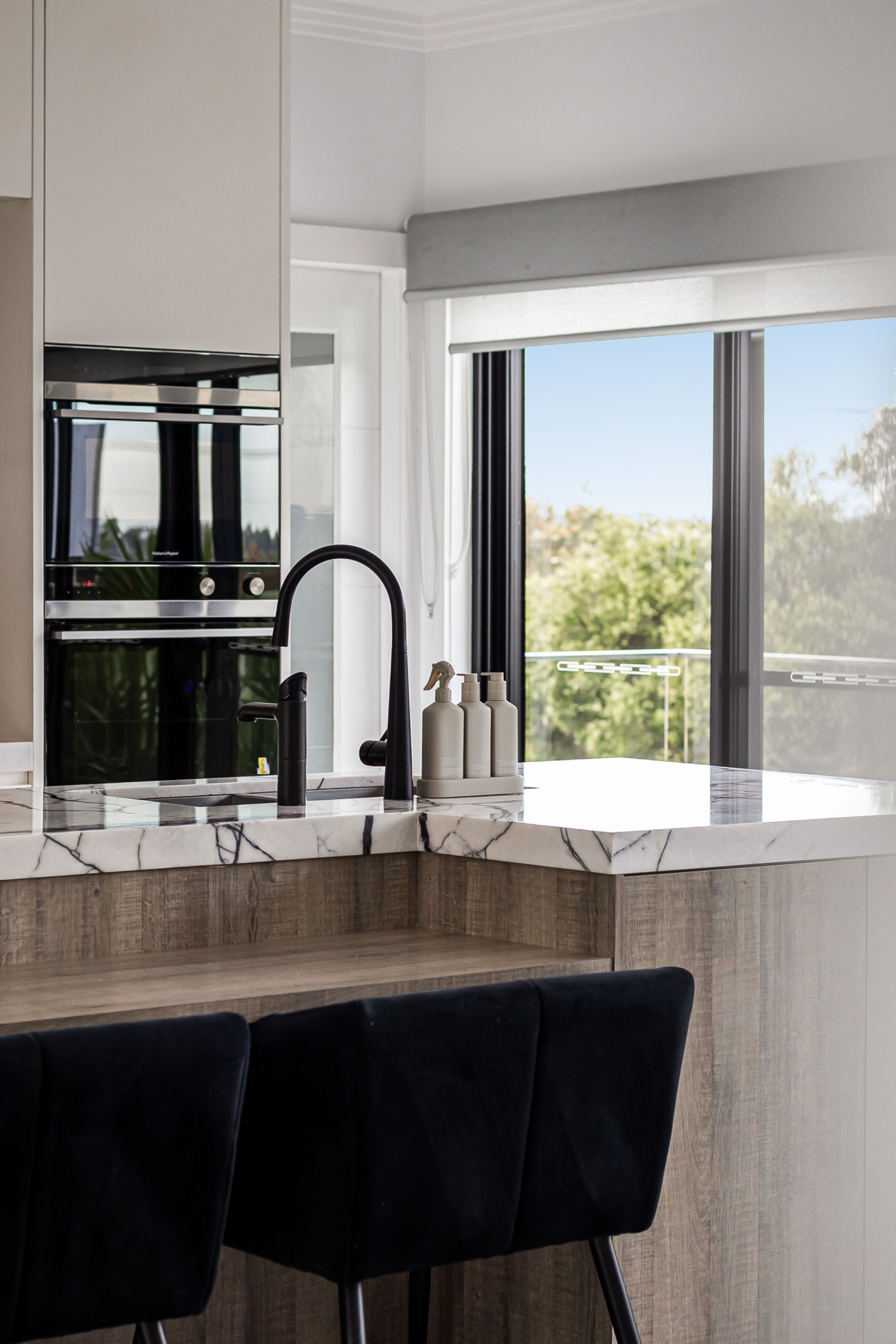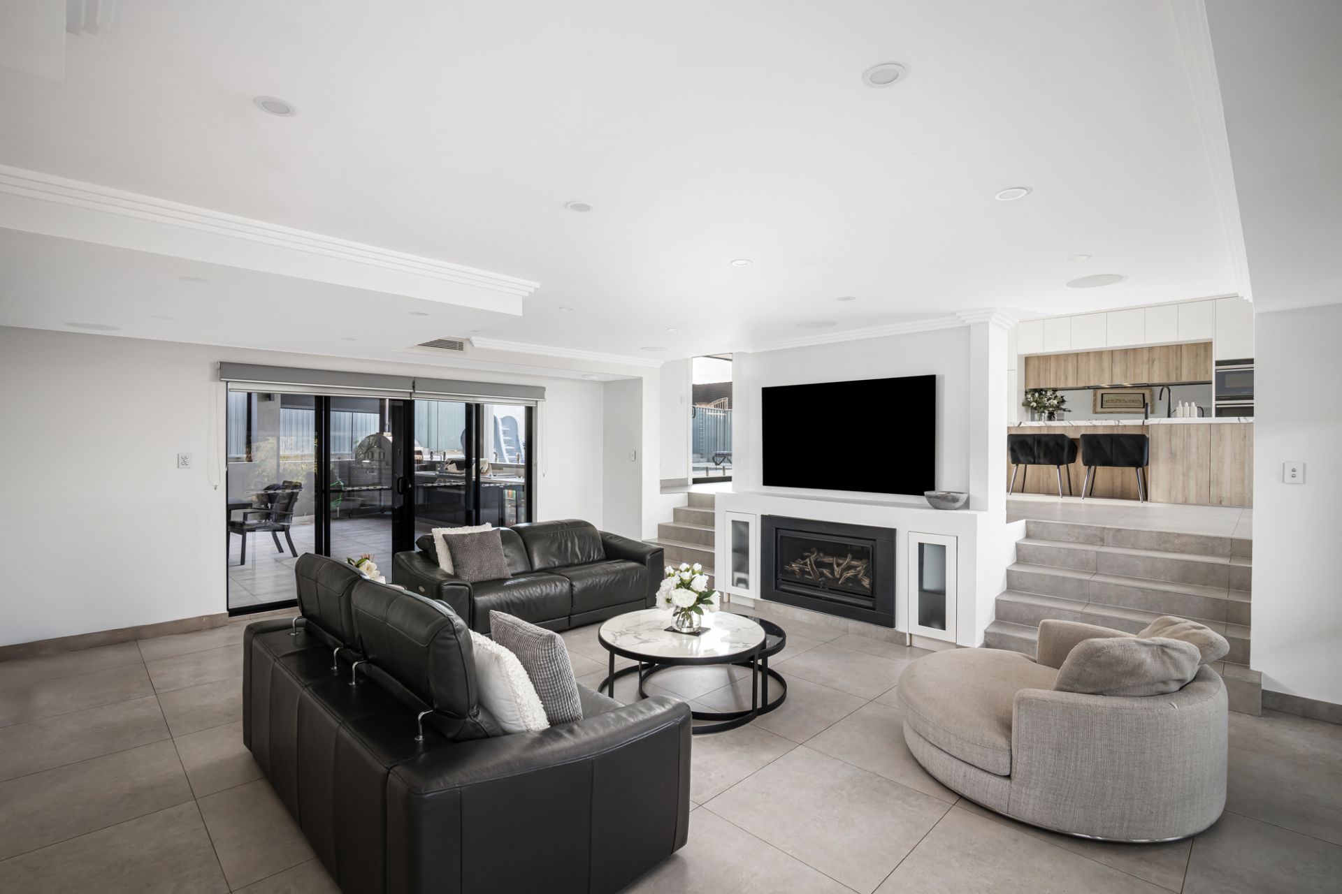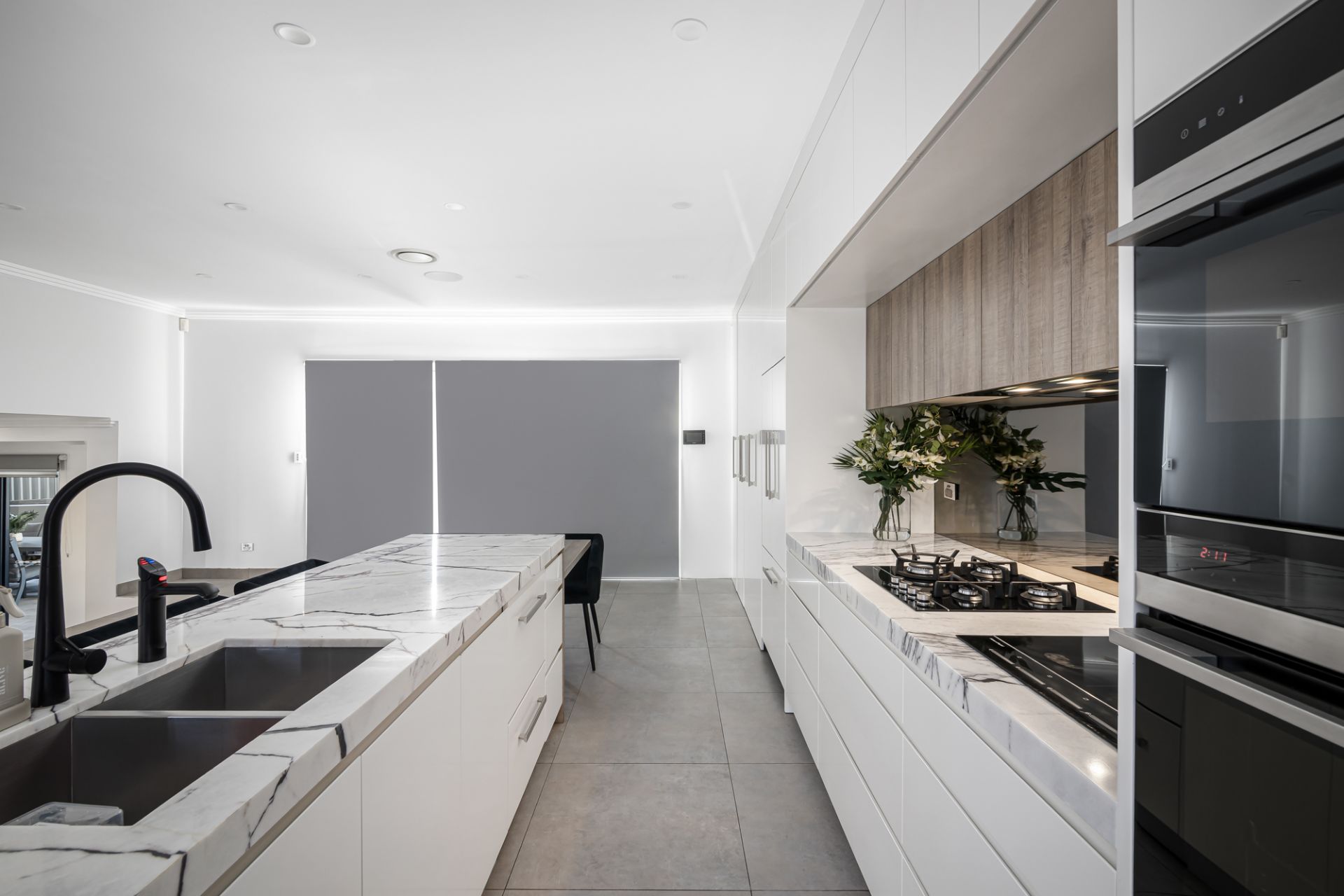 • Contemporary kitchen with six-seater wrap-around breakfast bar, island bench, walk-in pantry, 60mm stone benchtops, stainless-steel appliances, integrated fridge & dishwasher, mirrored splashback, abundant storage space and extensive preparation area