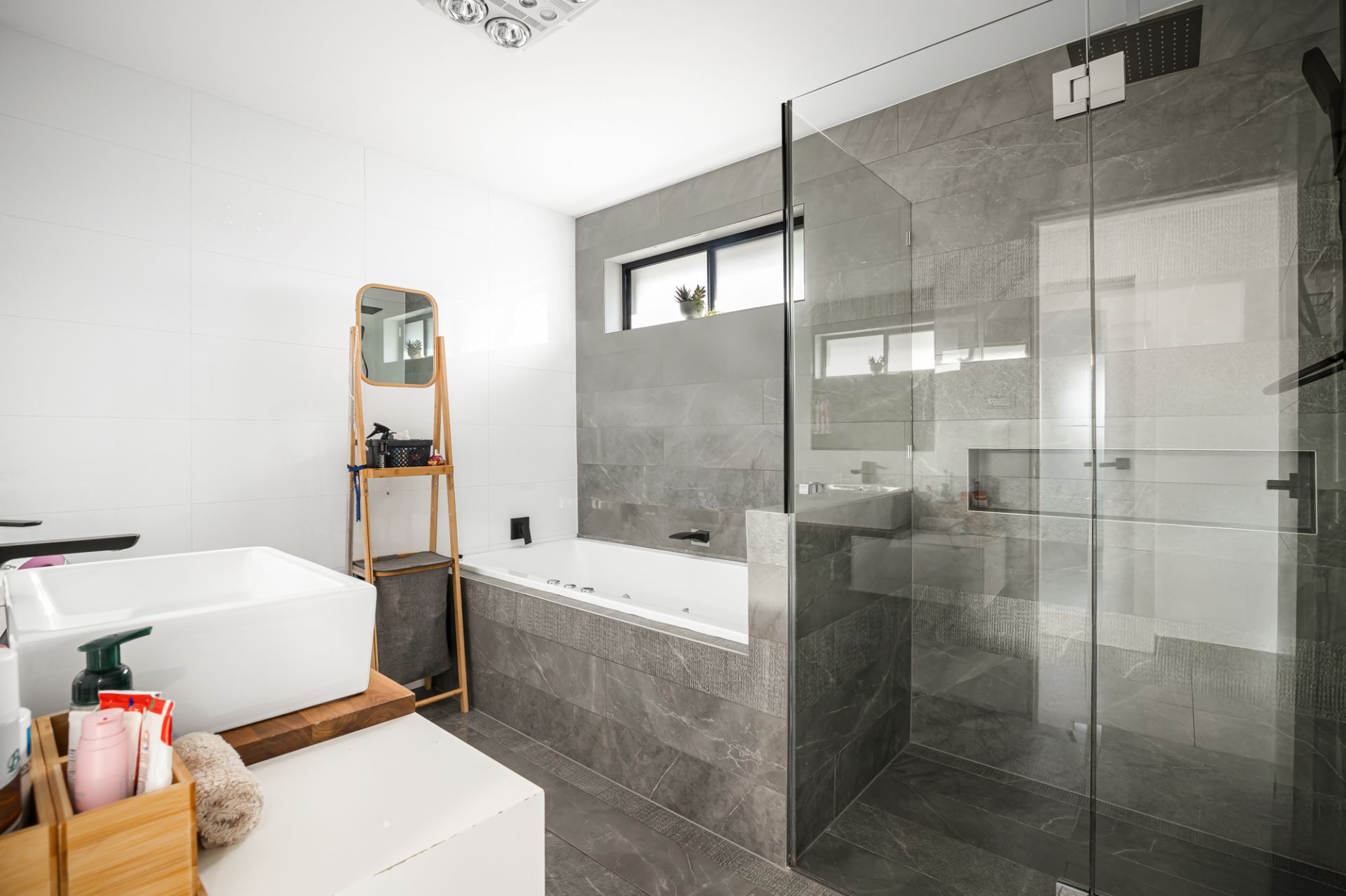 • Elegant fully-tiled family bathroom with frameless shower and deep bath, plus downstairs bathroom/toilet with separate bath and shower