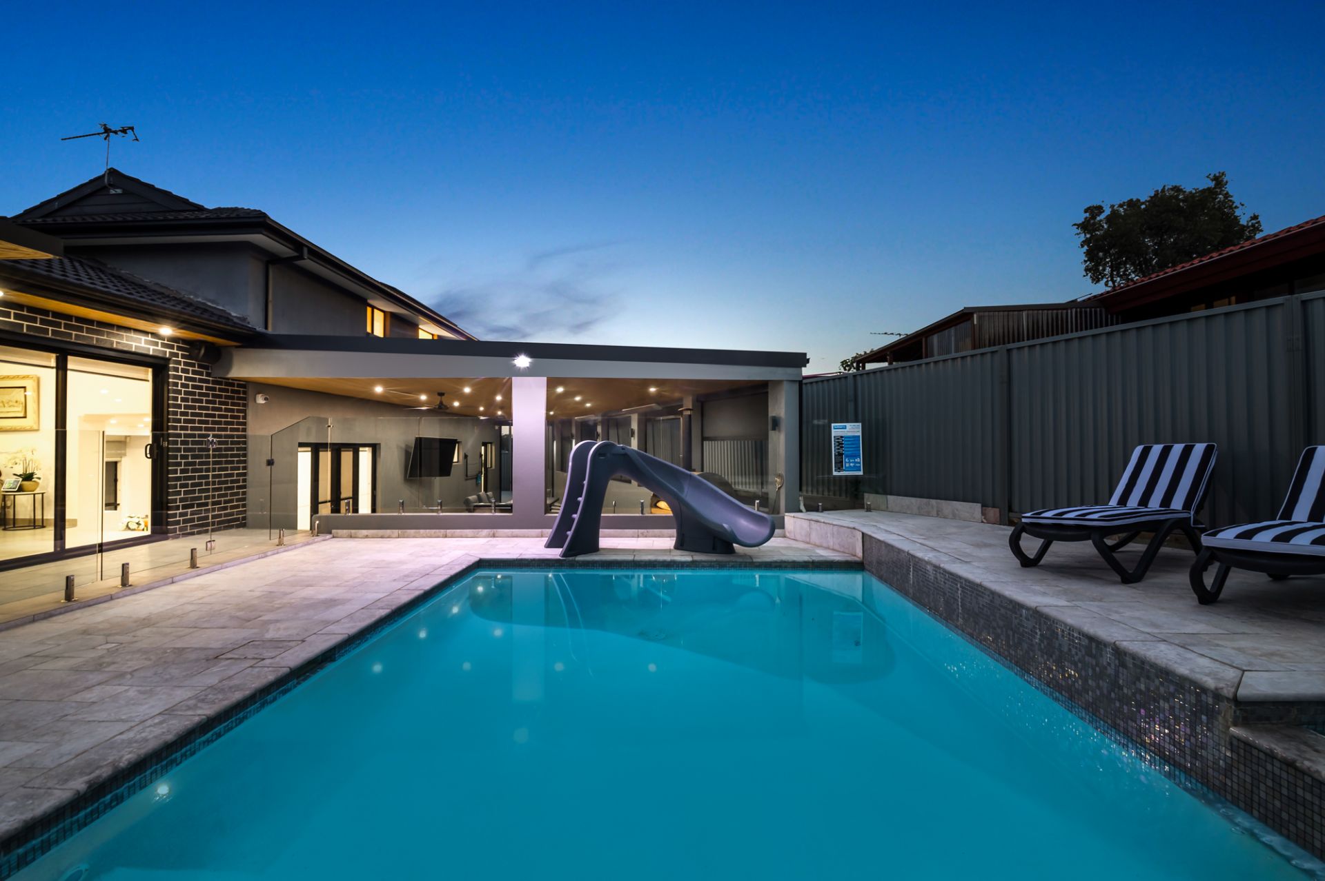 From its immaculate, broad two-tiered front yard to its swimming pool and magnificent, high-class entertaining area out back, this sensational home proclaims its grandeur. Externally, your home is set high on your 735.6 m2 block. Inside, for a home this stunning, it is astonishingly uncomplicated and practical in its design, the upstairs bedrooms nicely separated from the downstairs communal areas, and the living areas complementing the grand covered outdoor entertaining area, which in turn leads to your luxurious pool area – the whole package providing the most seamless, comfortable and warmly ambient indoor-outdoor hosting experience imaginable. Included is a study/office, and balconies and porches so roomy, the largest of gatherings will enjoy the environs of your magnificent abode in complete comfort. There are character features and high-end appointments too numerous to mention here in this double-storey, split-level designed masterpiece. From its high-end tiled floors to its decorative cornices, it is simply splendid.